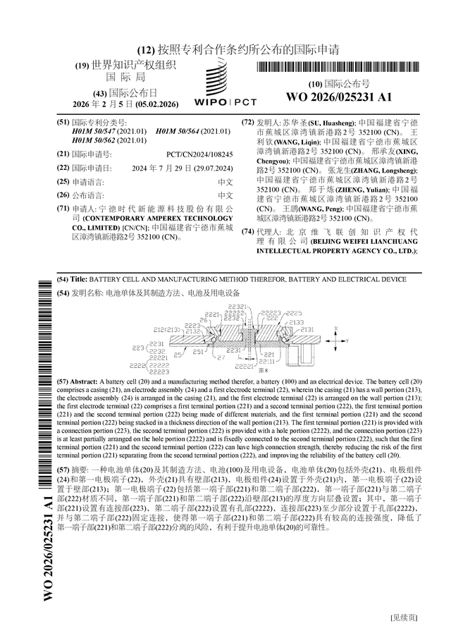 证券之星消息,根据企查查数据显示宁德时代(300750)公布了一项国际专利申请,专利名为“电池单体及其制造方法、电池及用电设备”,专利申请号为PCT/CN2024/108245,国际公布日为2026年2月5日。