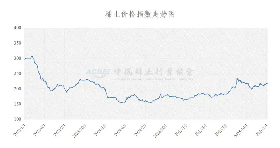 今日价格指数:217.6指数计算:稀土价格指数是由基期和报告期的交易数据计算组成,基期选用2010年全年的交易数据,报告期选用全国20多家稀土企业每天实时交易数据的平均值,代入稀土指数价格模型计算得出。(基期指数为100)