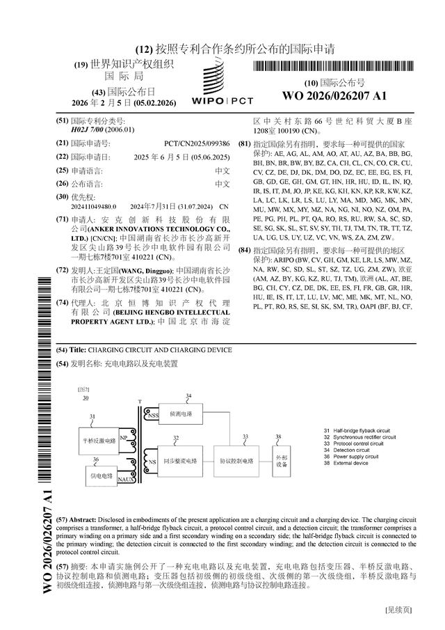 证券之星消息,根据企查查数据显示安克创新(300866)公布了一项国际专利申请,专利名为“充电电路以及充电装置”,专利申请号为PCT/CN2025/099386,国际公布日为2026年2月5日。