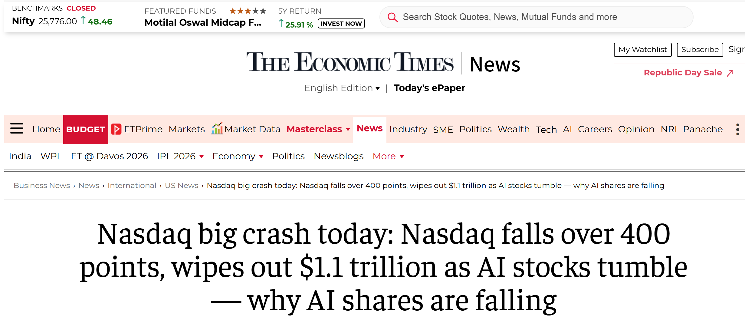 【环球网科技综合报道】2月5日消息,据The Economic Times报道,近期,全球软件与服务板块遭遇持续抛售,市场波动引发广泛关注。标普 500 软件与服务指数连续六个交易日下跌,自 1 月 28 日以来市值蒸发约 8300 亿美元,较去年 10 月高点回落 26%,本轮累计跌幅接近 13%。这一现象背后,人工智能技术的快速迭代与应用渗透成为核心影响因素。